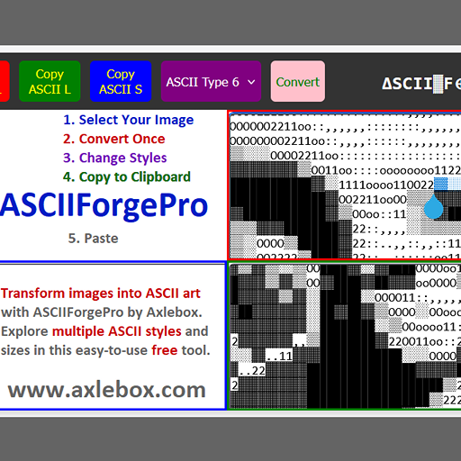 Transform your images into stunning ASCII art using ASCIIForgePro by Axlebox. Choose from multiple styles and sizes for creative text-based designs.