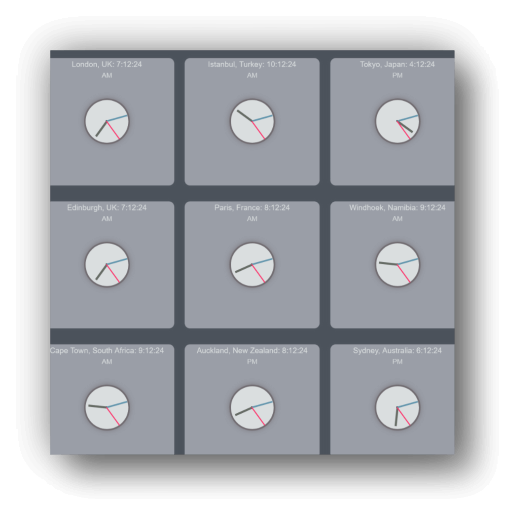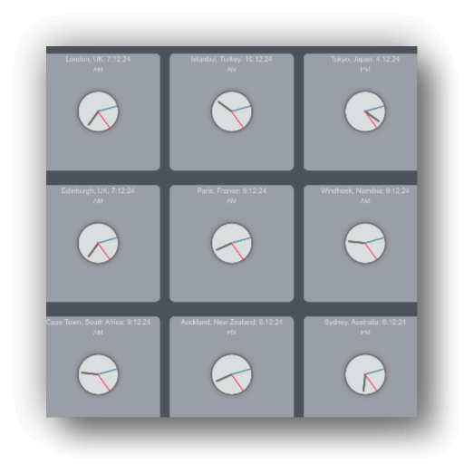 Real-time analog clocks for every major city + the most remote places on Earth (South Pole, Pitcairn, Vostok Station). Free, no ads, pure beauty.